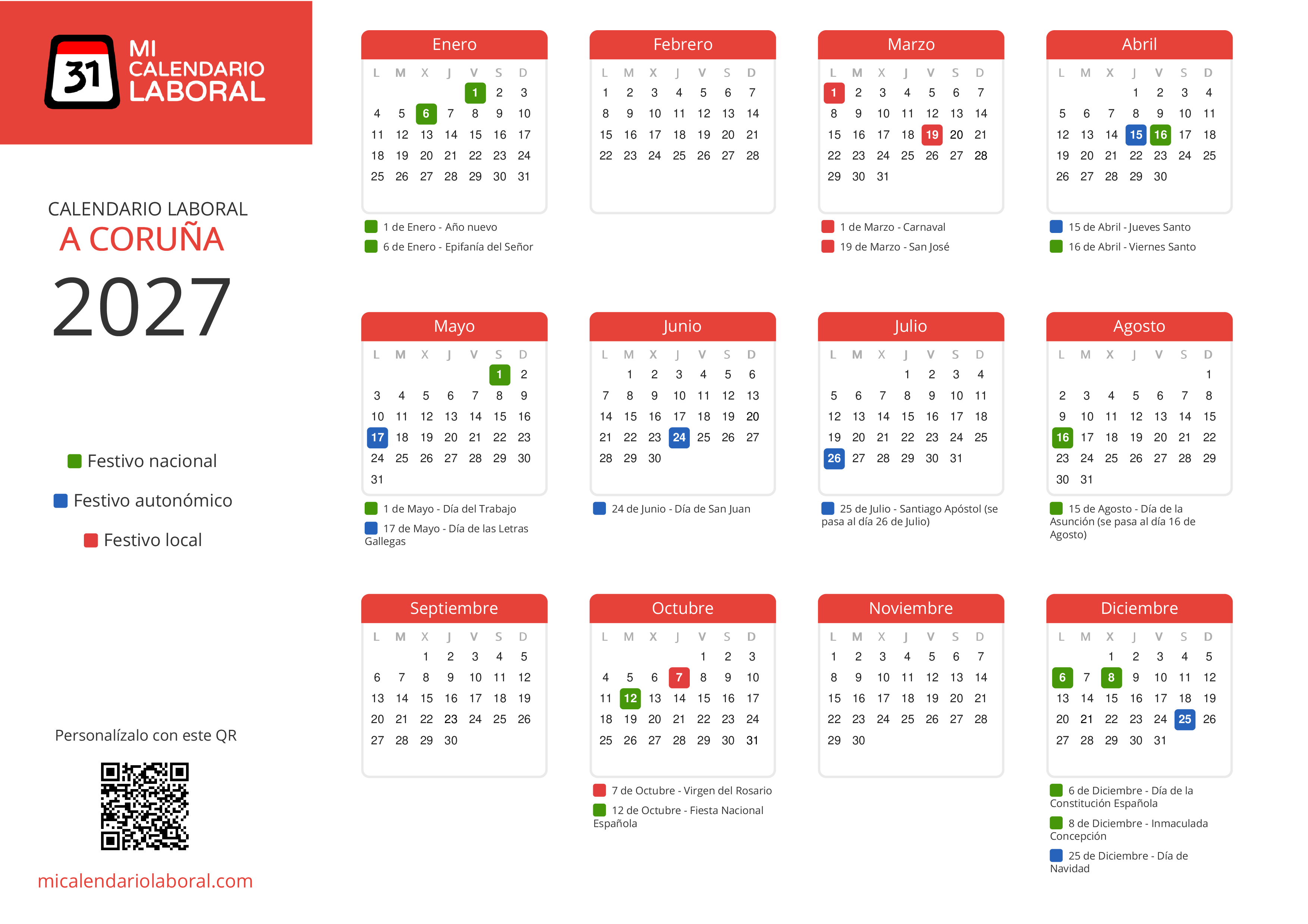 Así quedan los días festivos de Galicia en el 2027 con los días festivos locales de A Coruña:
