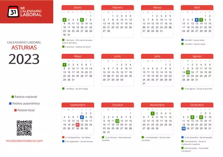 El calendario del año 2023 contará con 13 días festivos. Además de las 8 fiestas nacionales y las 4 establecidas por Gobierno del Principado de Asturias, cada municipio celebra 1 festividades locales adicionales.