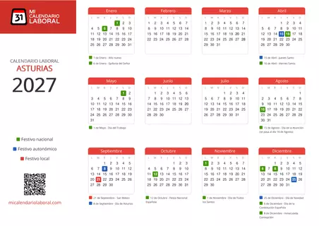 El calendario del año 2027 contará con 13 días festivos. Además de las 8 fiestas nacionales y las 4 establecidas por Gobierno del Principado de Asturias, cada municipio celebra 1 festividades locales adicionales.