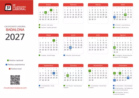 Almanaque de festivos en Badalona para el año 2027