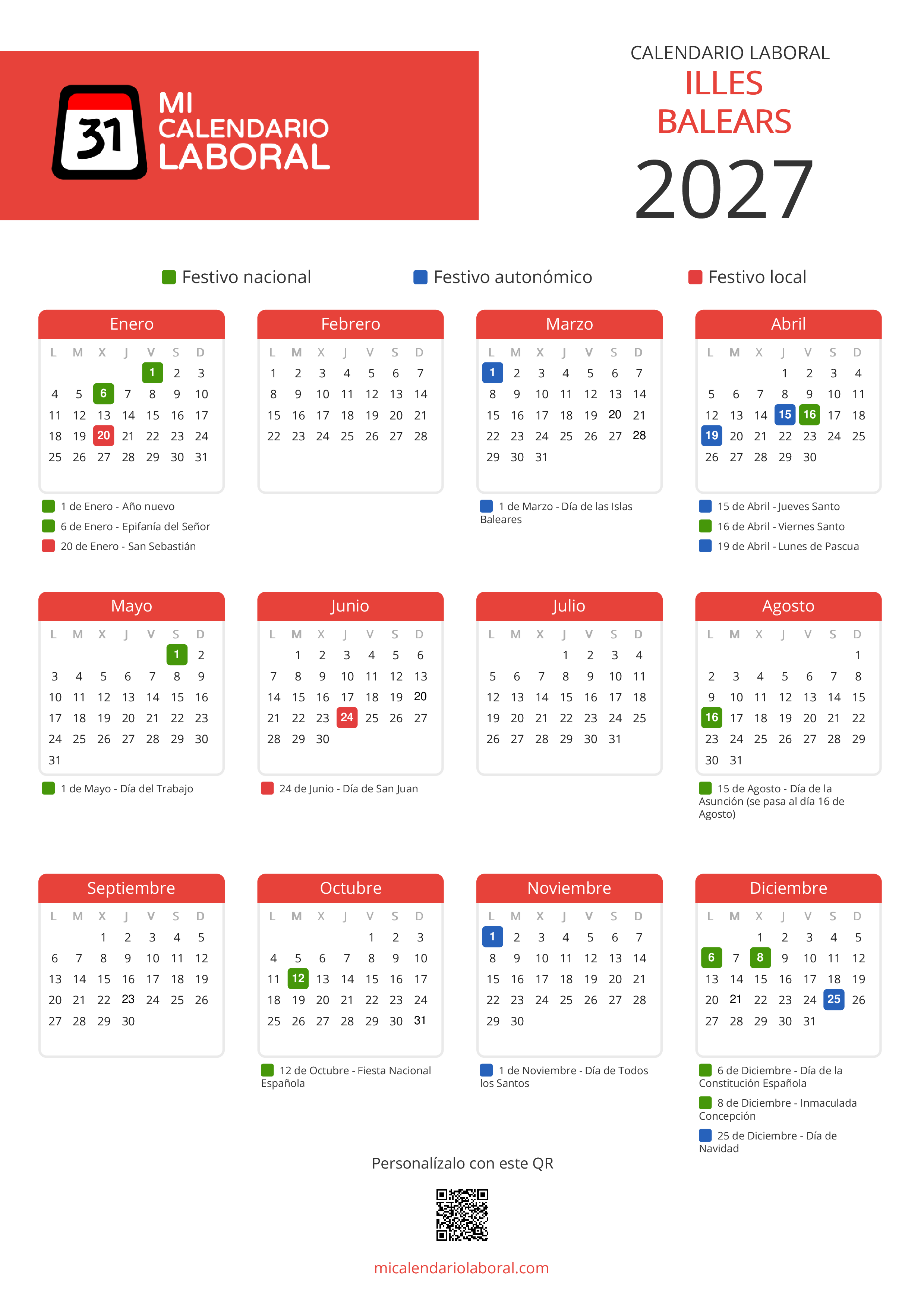 Así quedan los días festivos de Illes Balears en el 2027 con los días festivos locales de Illes Balears: