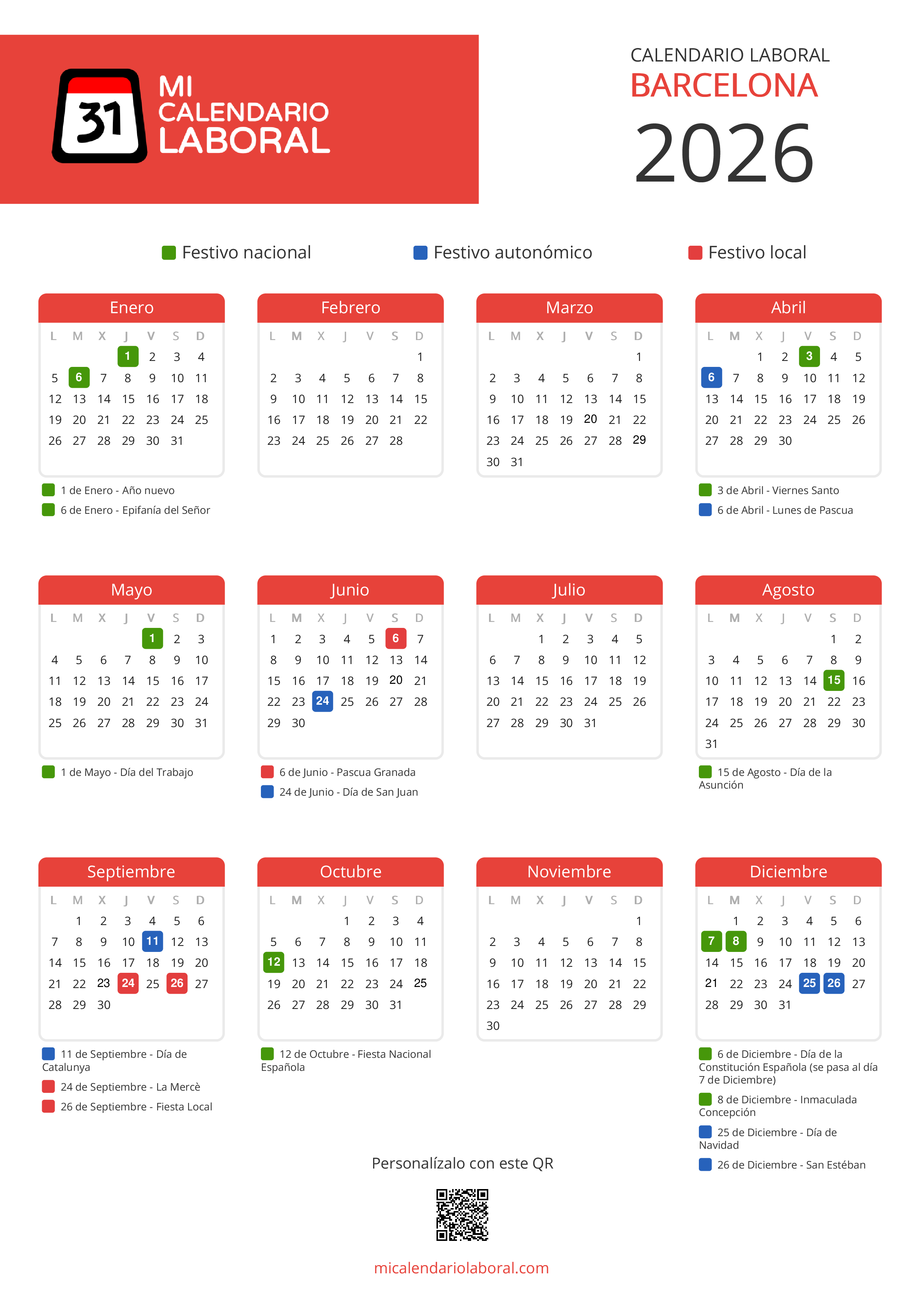 Almanaque de festivos en Barcelona para el año 2026