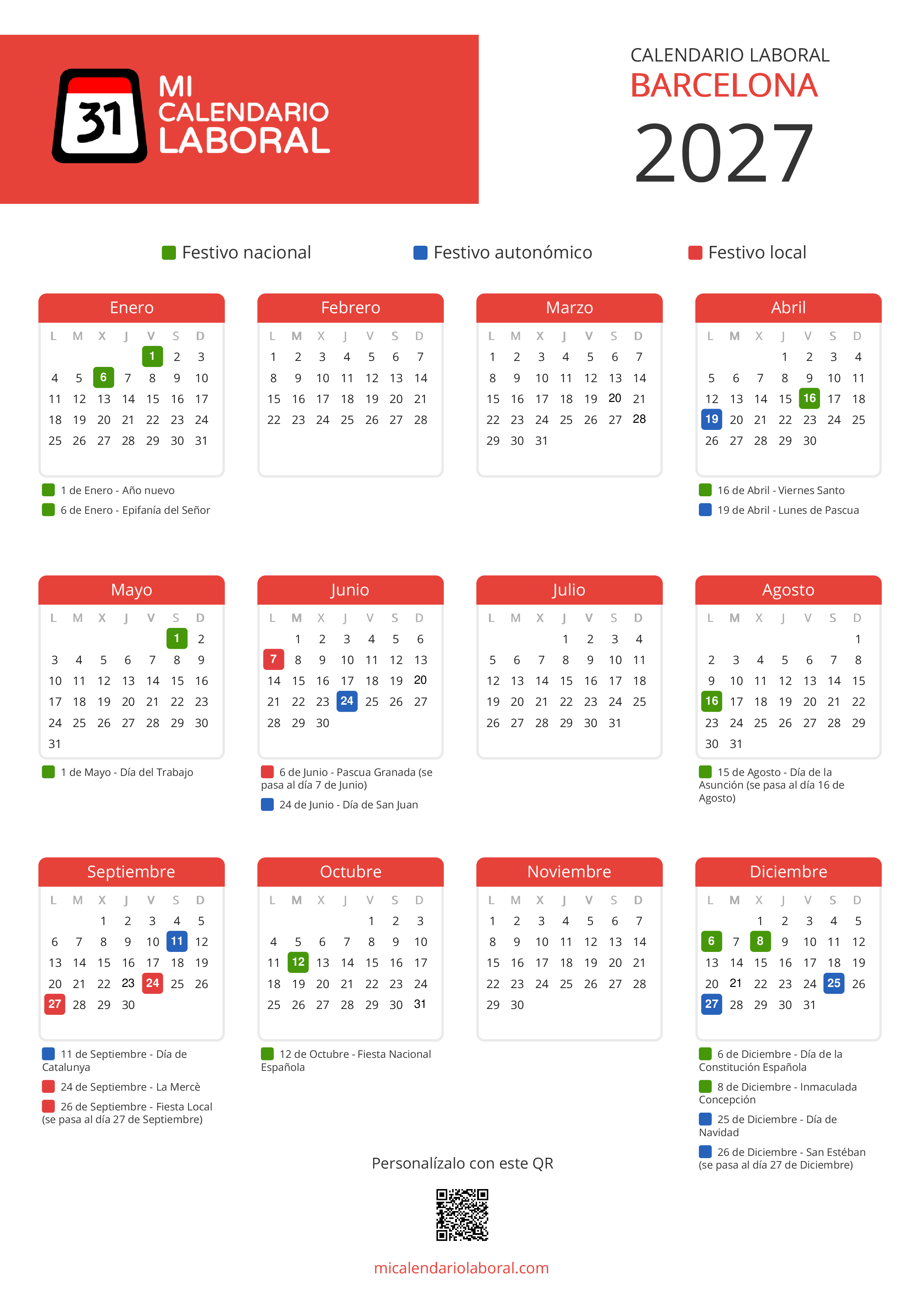 El calendario laboral del año 2027 contará con 14 días festivos. En complemento a las 7 festividades nacionales y las 5 asignadas por Generalitat de Catalunya, los municipios suman 2 celebraciones locales.