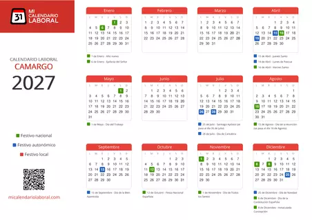 Almanaque de festivos en Camargo para el año 2027