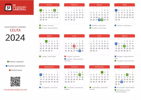 El calendario del año 2024 contará con 15 días festivos. Se agregan a las 7 festividades nacionales y las 7 dispuestas por Gobierno de la Ciudad Autónoma de Ceuta un total de 1 fiestas locales elegidas por los municipios.