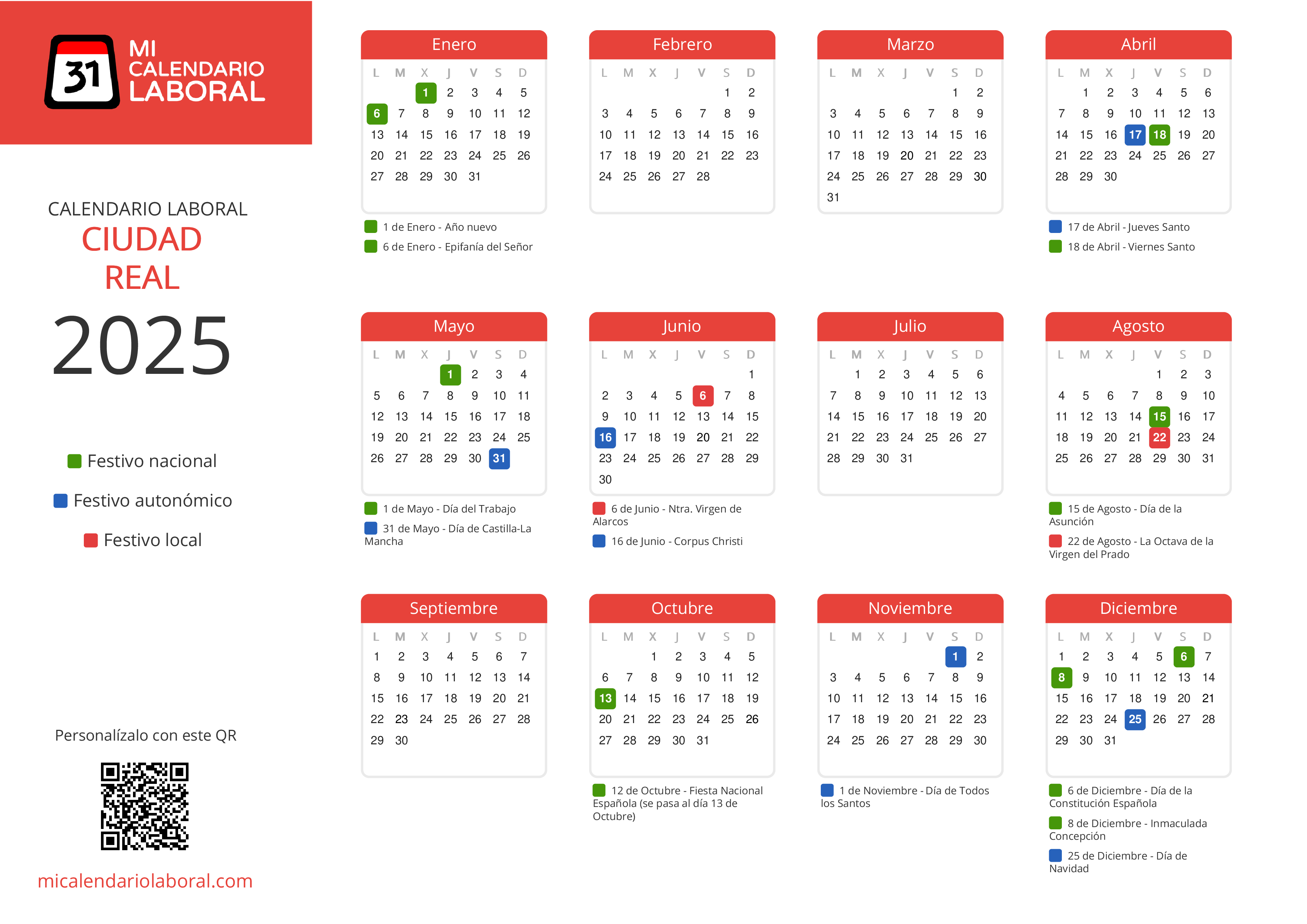 Almanaque de festivos en Ciudad Real para el año 2025