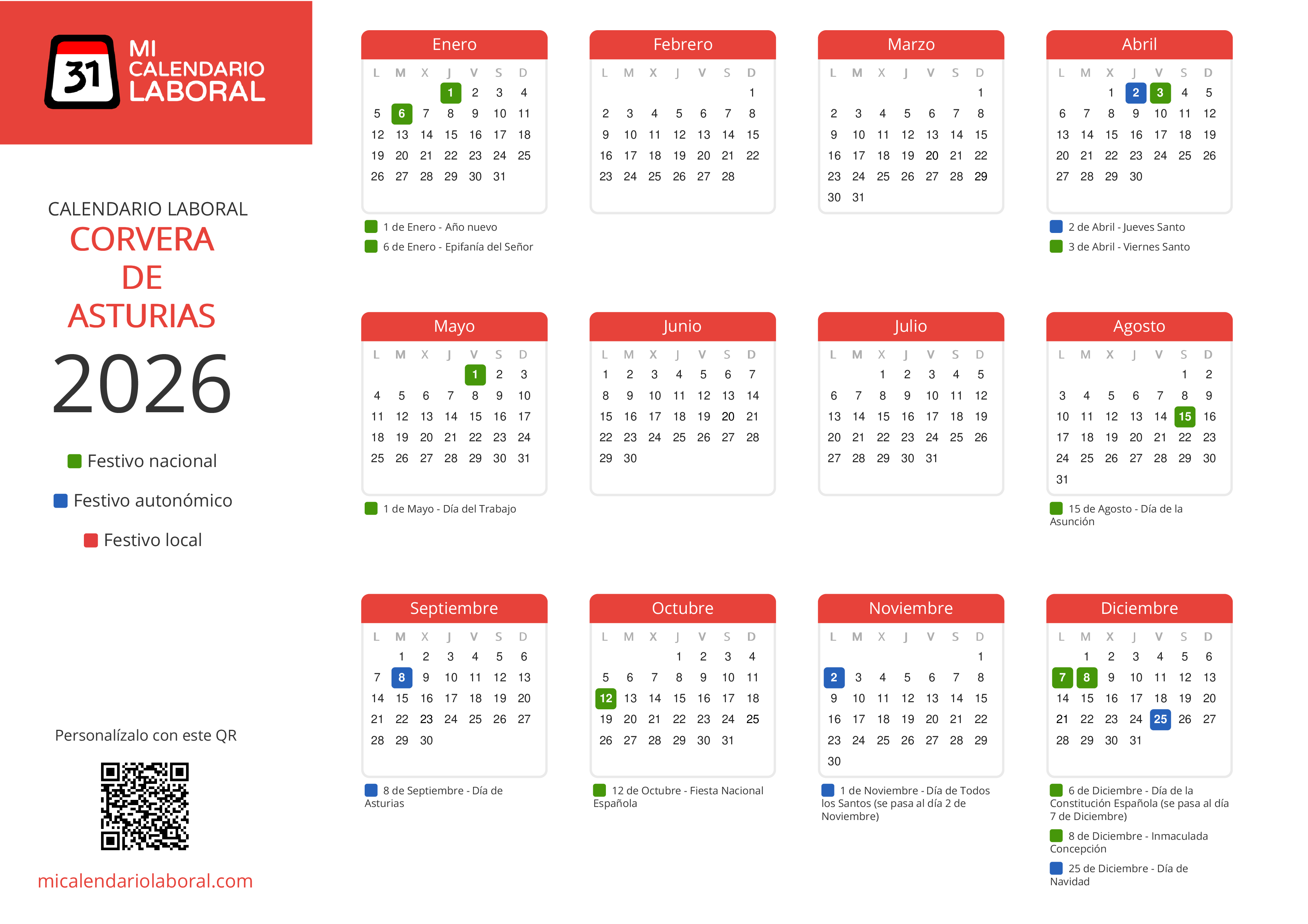 Almanaque de festivos en Corvera de Asturias para el año 2026