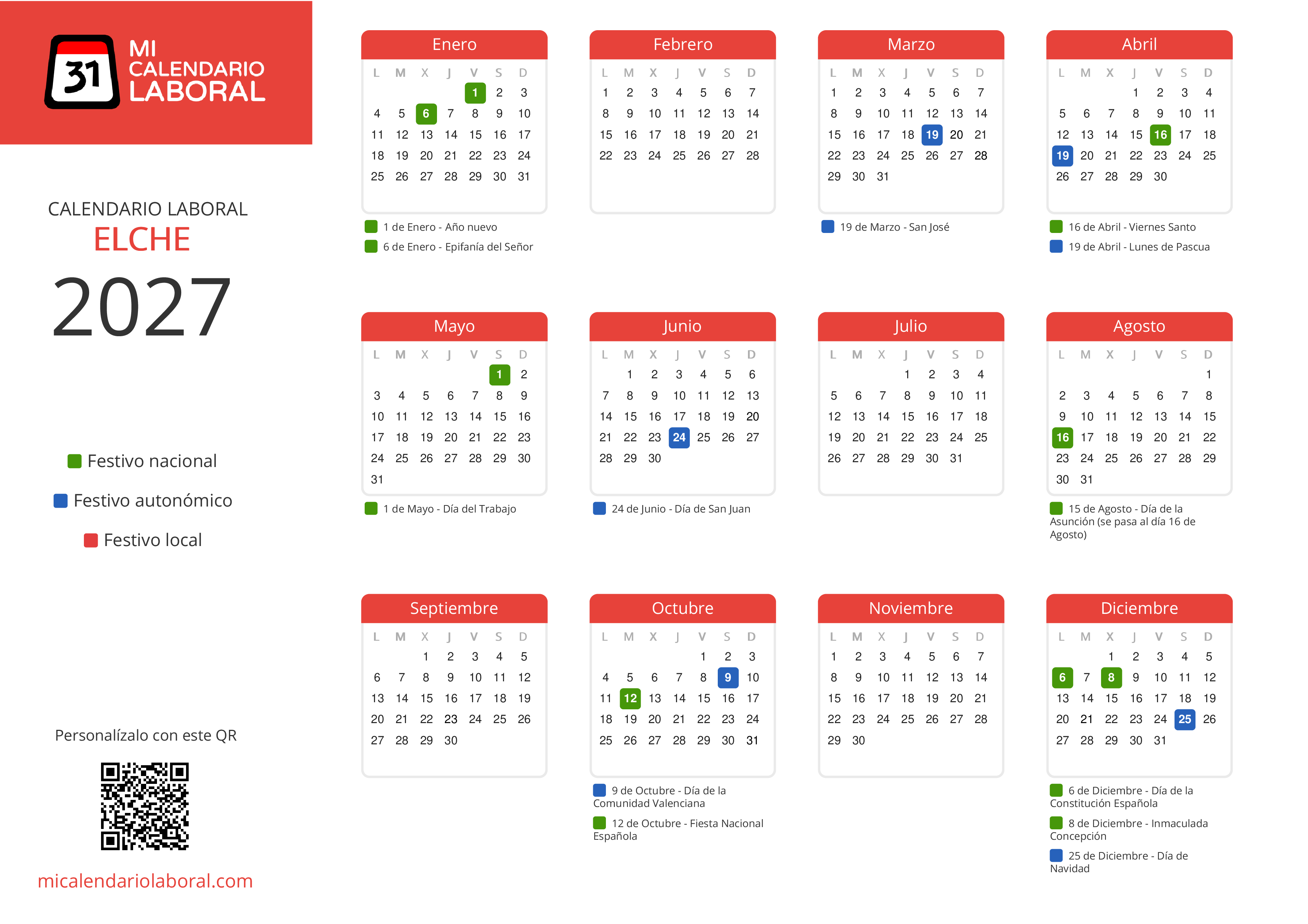 Así quedan los días festivos de Comunitat Valenciana en el 2027 con los días festivos locales de Elche: