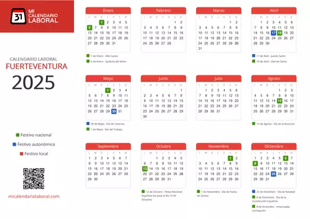 Estos son todos los días no laborables y días inhábiles correspondientes a Fuerteventura, proporcionados por el Ministerio del Trabajo y Gobierno de Canarias.