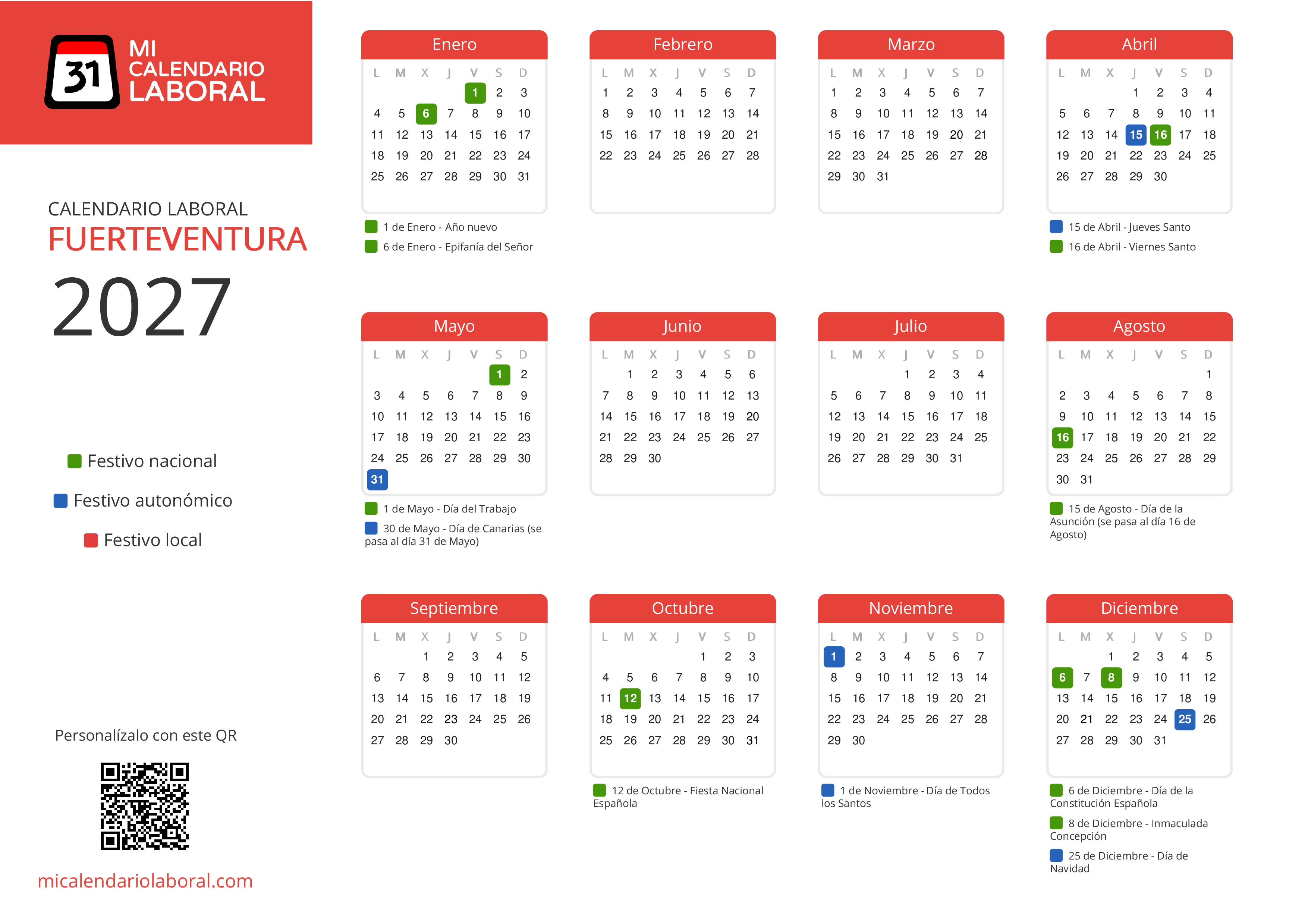 Así quedan los días festivos de Canarias en el 2027 con los días festivos locales de Fuerteventura: