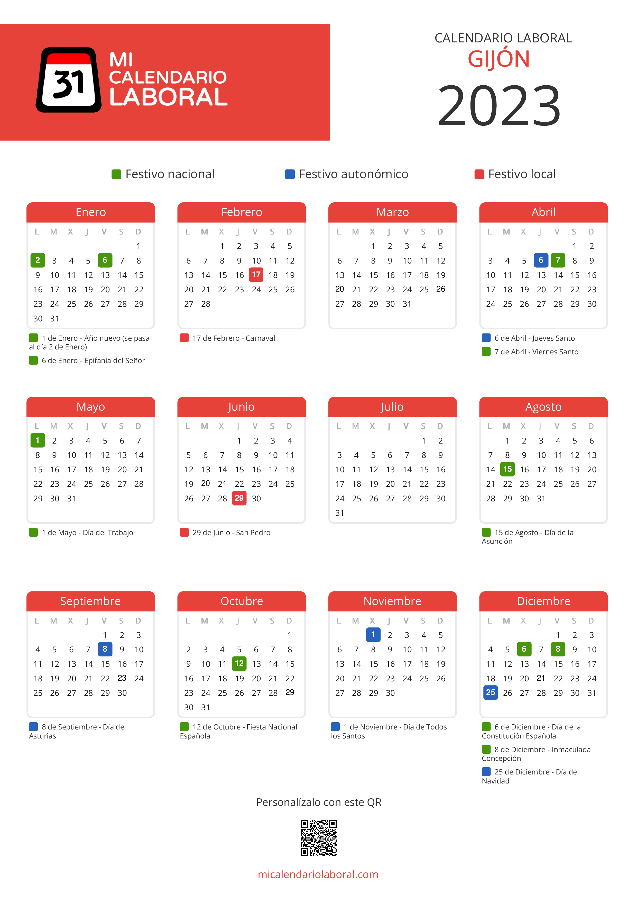 El calendario laboral Gijón 2023 contará con 14 días festivos. Se incluyen en total 8 festividades nacionales y 4 autonómicas de Gobierno del Principado de Asturias, además de 2 celebraciones locales de cada municipio.