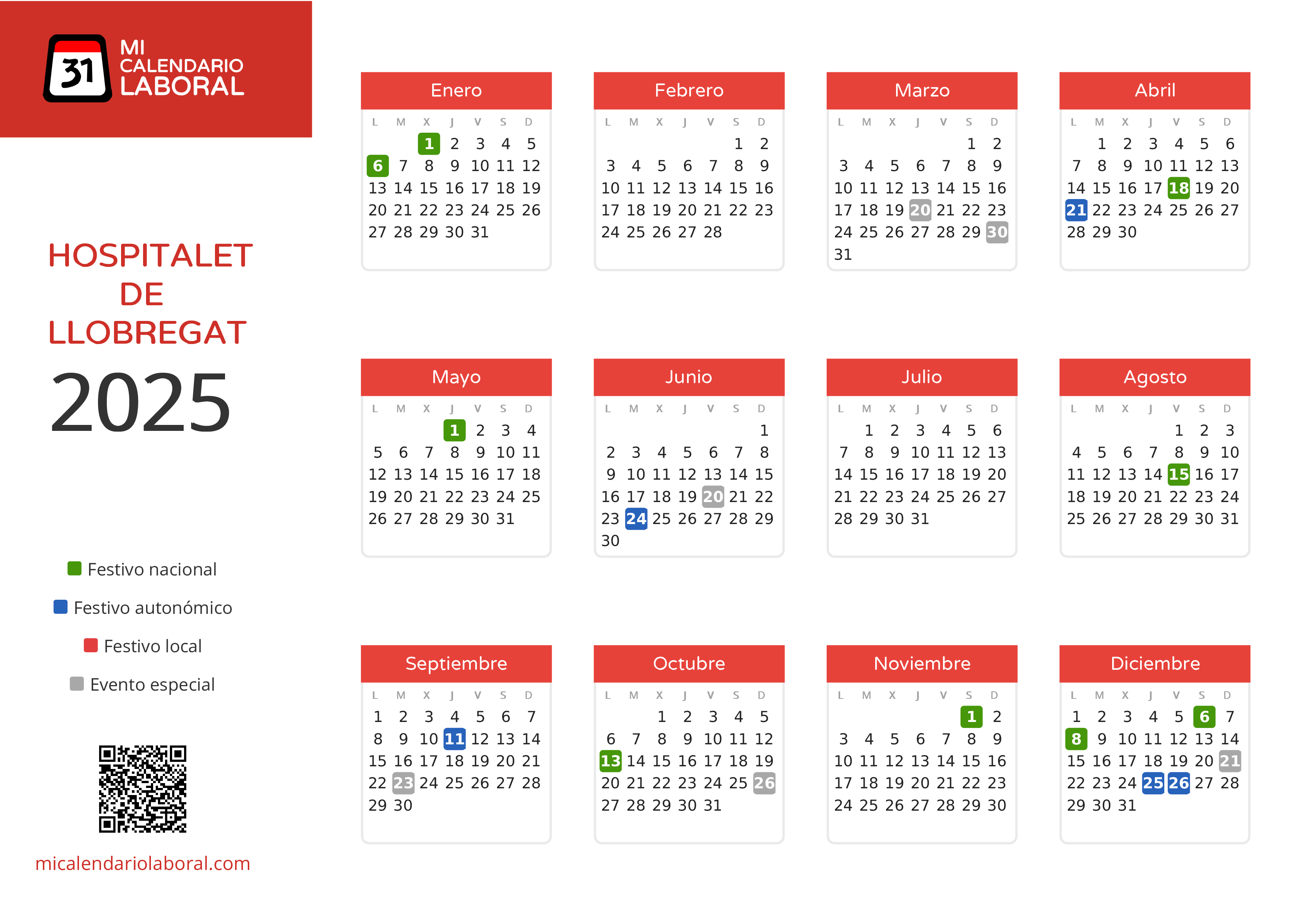 El calendario laboral de Hospitalet de Llobregat del año 2025 contará con 14 días festivos. Además de las 7 fiestas nacionales y las 5 otorgadas por Generalitat de Catalunya, los municipios seleccionan 2 fiestas locales.