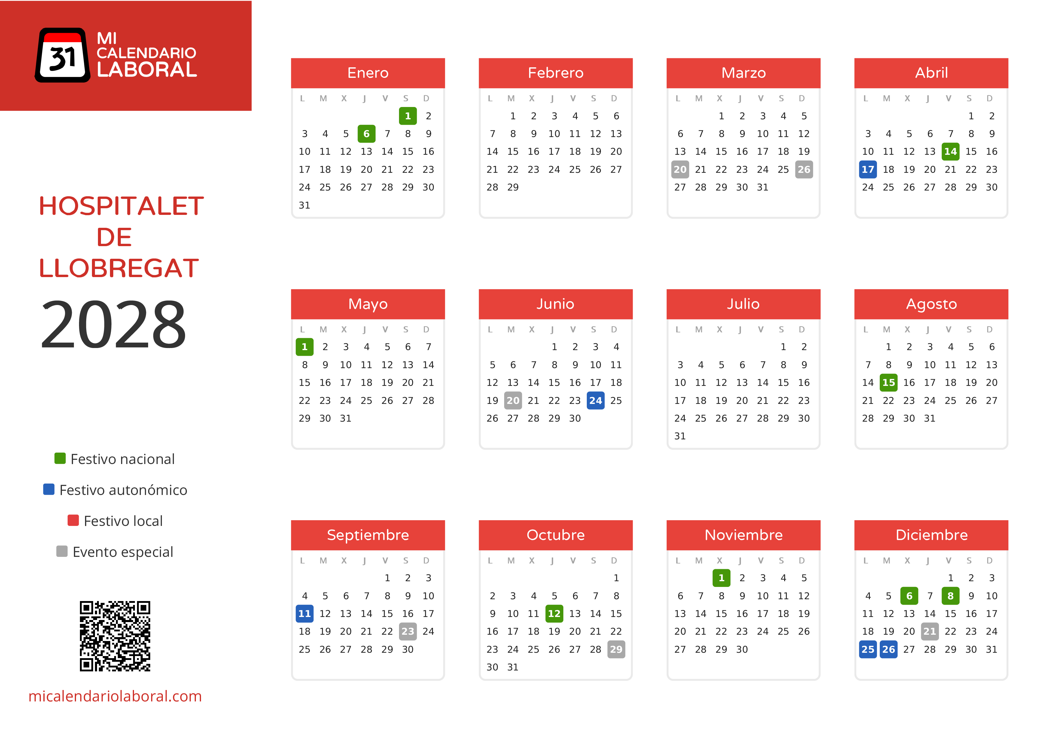 El calendario laboral de Hospitalet de Llobregat del año 2028 contará con 14 días festivos. Además de las 7 fiestas nacionales y las 5 otorgadas por Generalitat de Catalunya, los municipios seleccionan 2 fiestas locales.