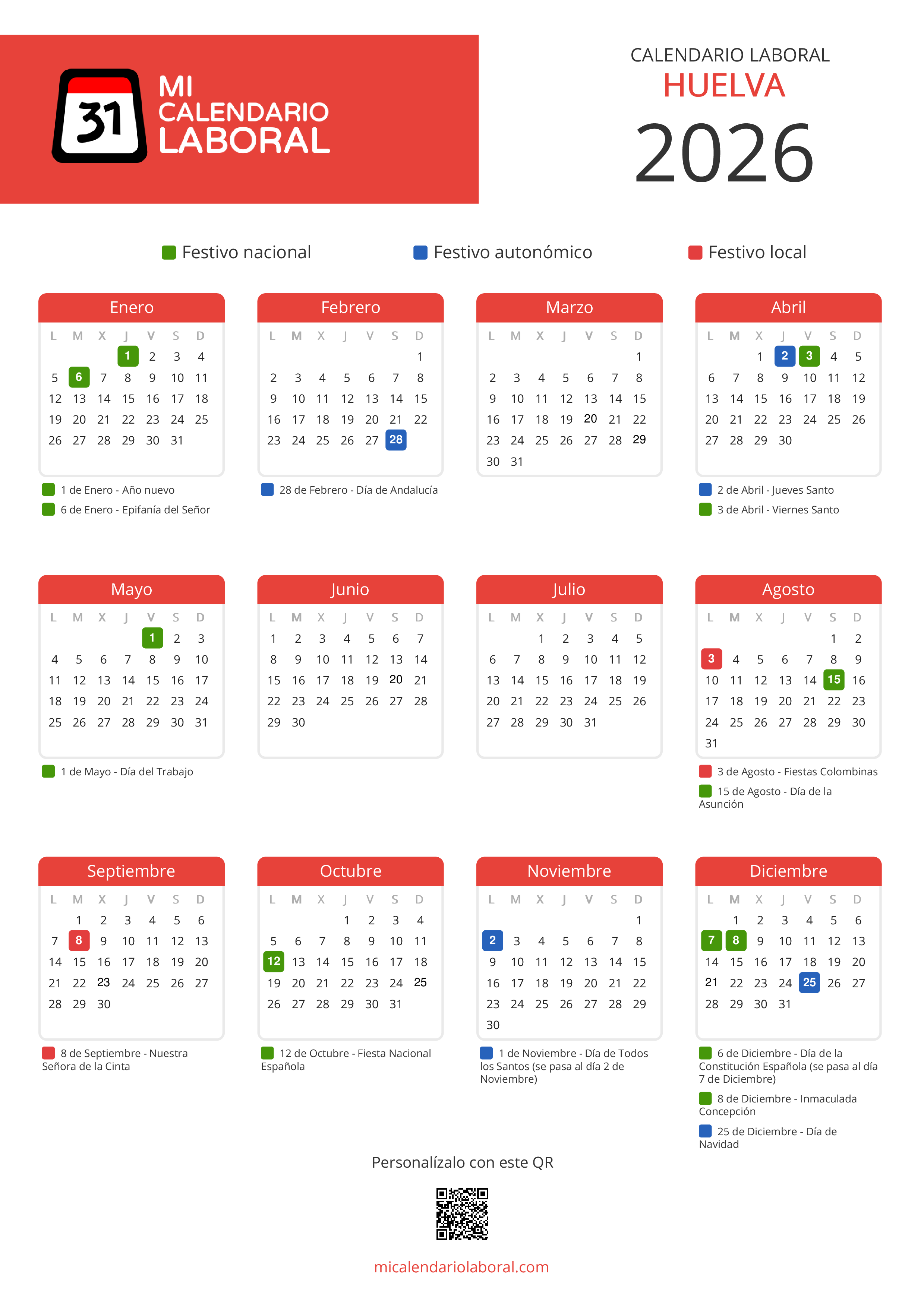 En Huelva, los días no laborables y días inhábiles son los siguientes, de acuerdo al Ministerio del Trabajo y Junta de Andalucía.