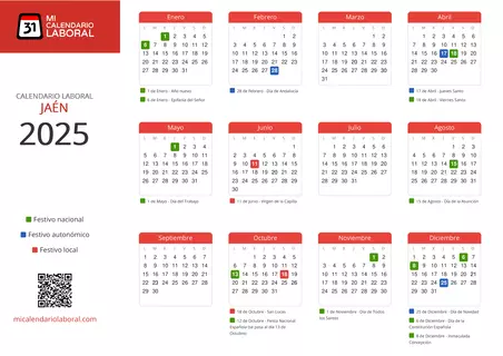 Los días no laborables y días inhábiles en Jaén están proporcionados por el Ministerio del Trabajo y Junta de Andalucía.