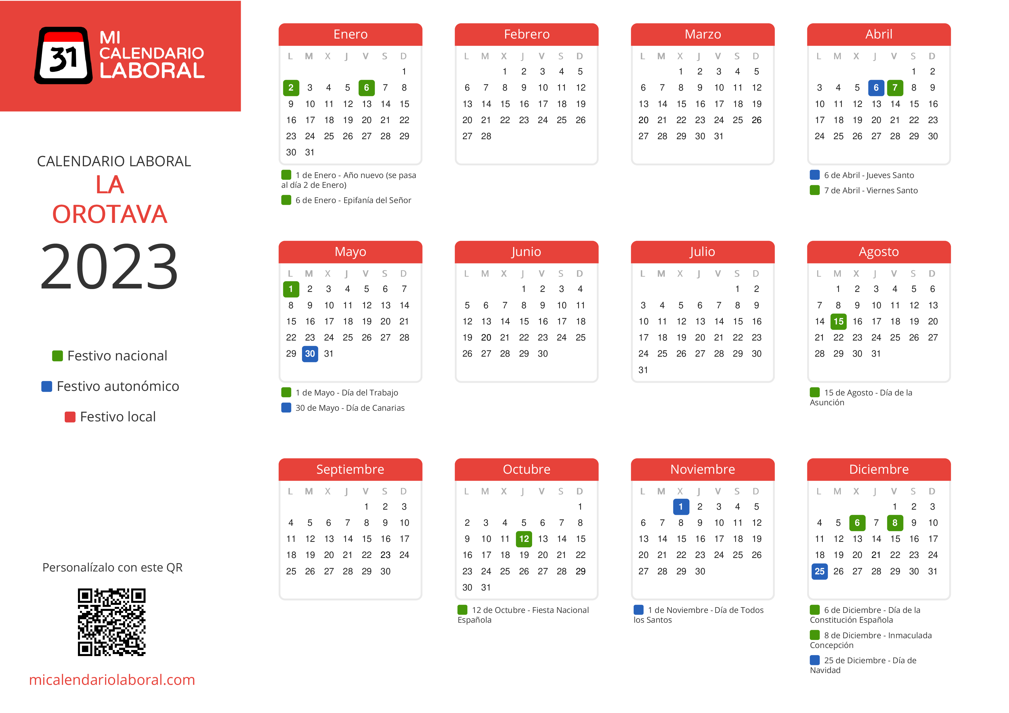 Almanaque de festivos en La Orotava para el año 2023