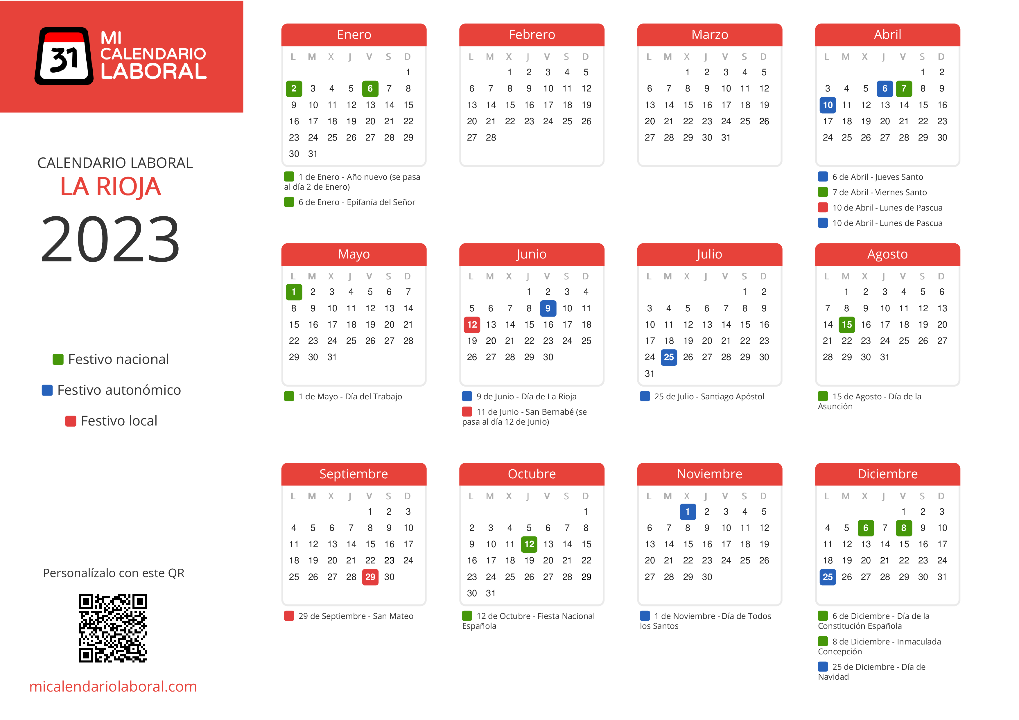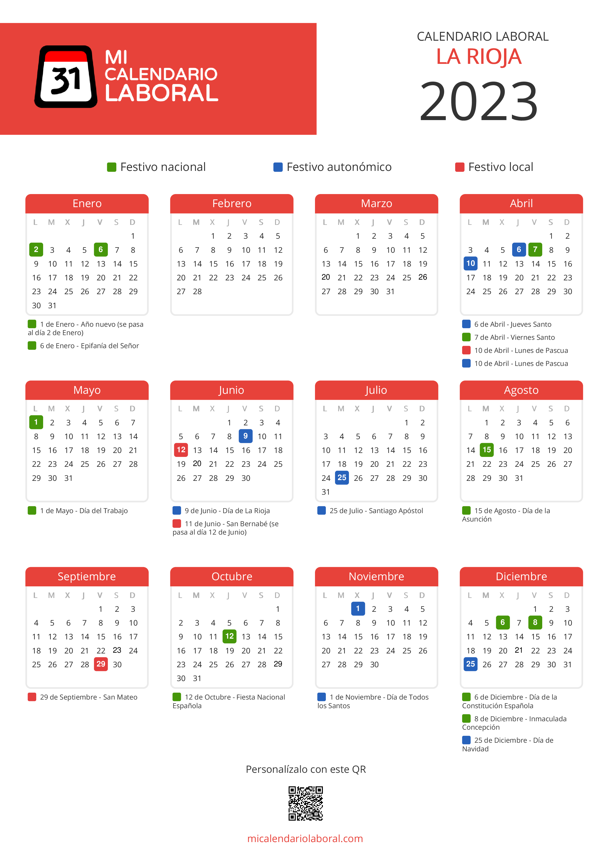 Almanaque de festivos en La Rioja para el año 2023
