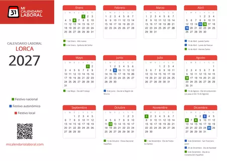 Almanaque de festivos en Lorca para el año 2027