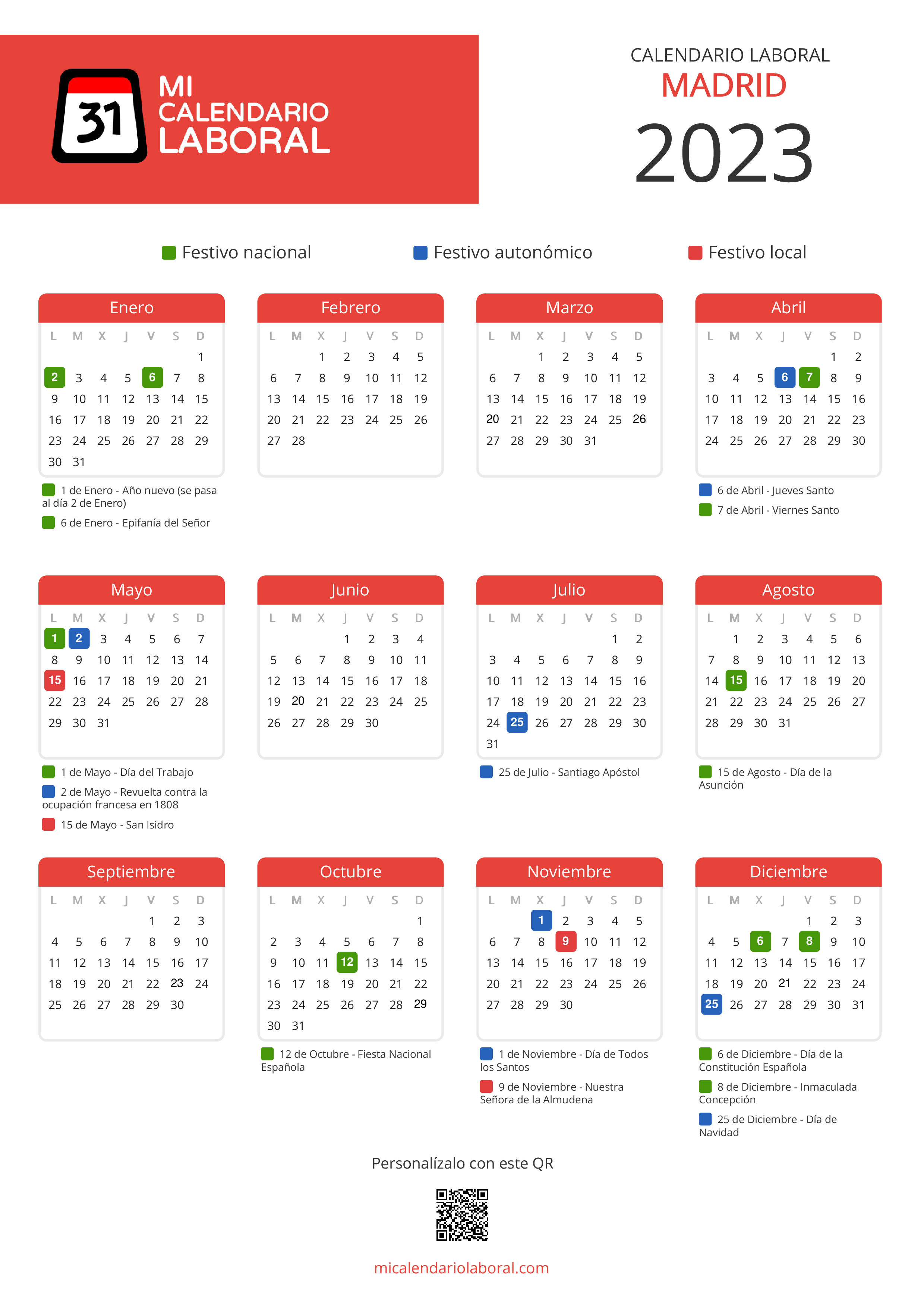 Este 2023, en Madrid habrán 8 festivos nacionales, a destacar los siguientes: Año nuevo (se pasa al día 2 de Enero) Epifanía del Señor Viernes Santo Día del Trabajo Día de la Asunción Fiesta Nacional Española Día de la Constitución Española, Inmaculada Concepción .