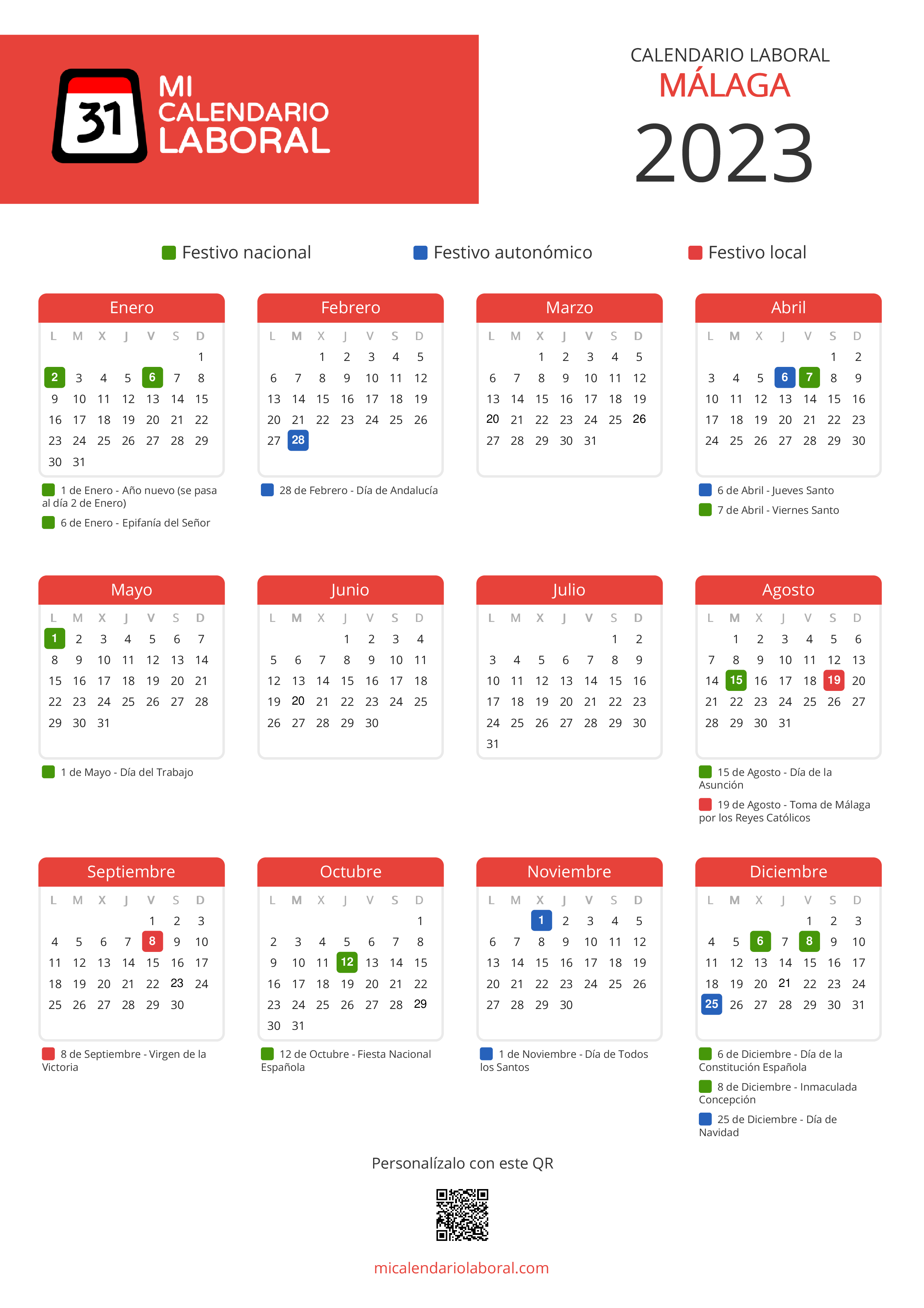 Este 2023, en Málaga habrán 8 festivos nacionales, a destacar los siguientes: Año nuevo (se pasa al día 2 de Enero) Epifanía del Señor Viernes Santo Día del Trabajo Día de la Asunción Fiesta Nacional Española Día de la Constitución Española, Inmaculada Concepción .
