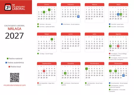 Así quedan los días festivos de Andalucía en el 2027 con los días festivos locales de Málaga: