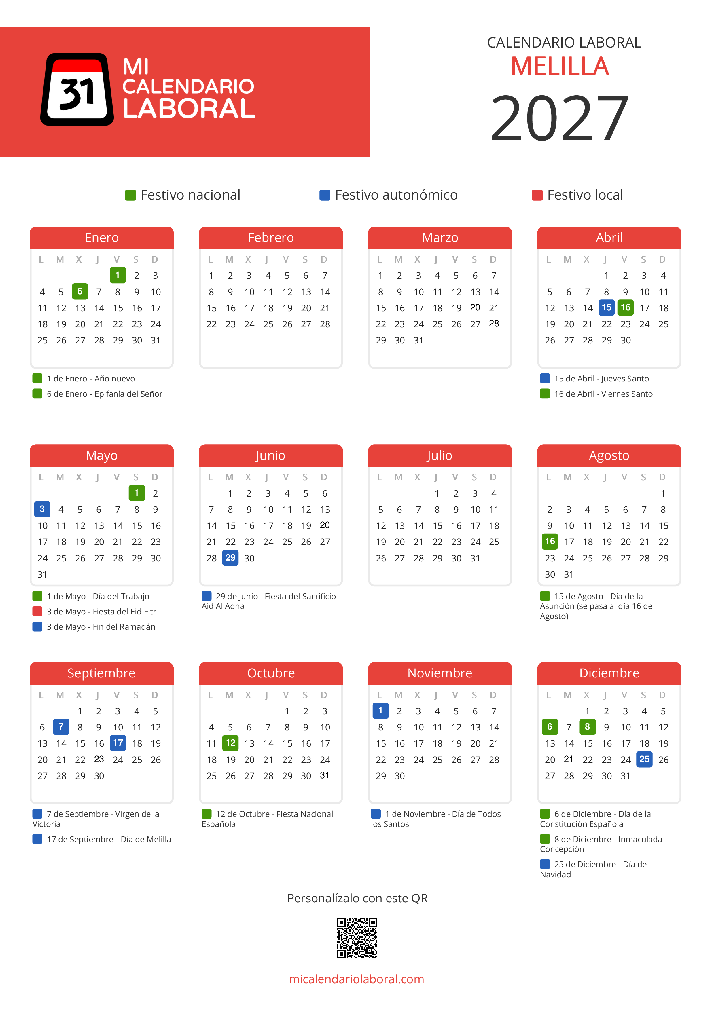 Almanaque de festivos en Melilla para el año 2027