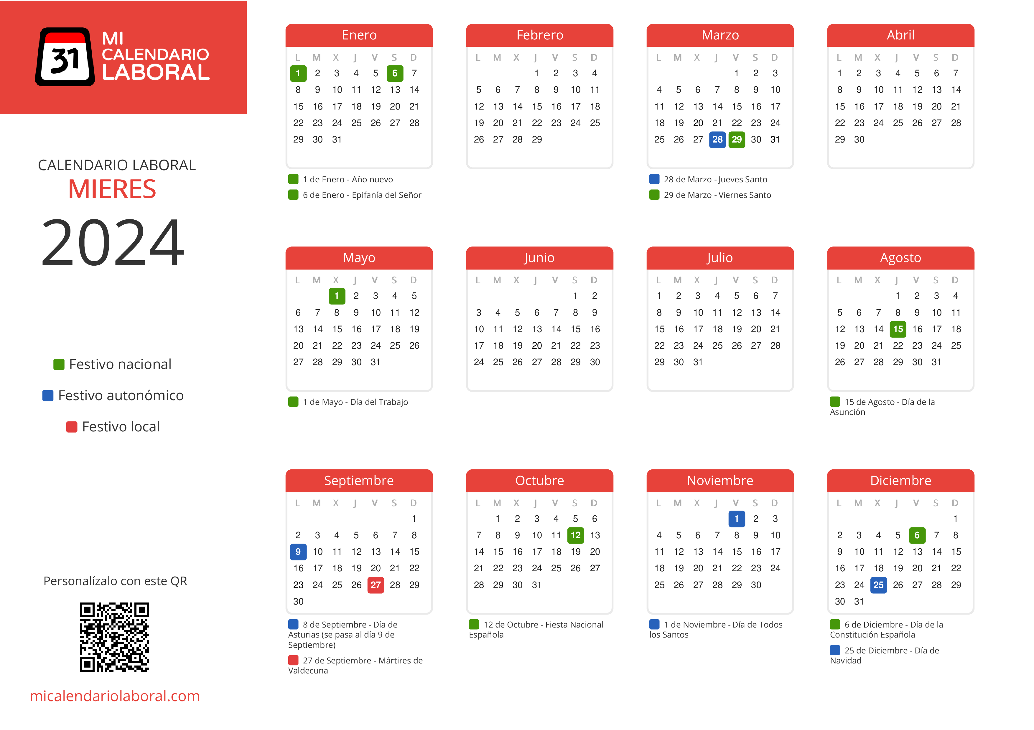 Almanaque de festivos en Mieres para el año 2024