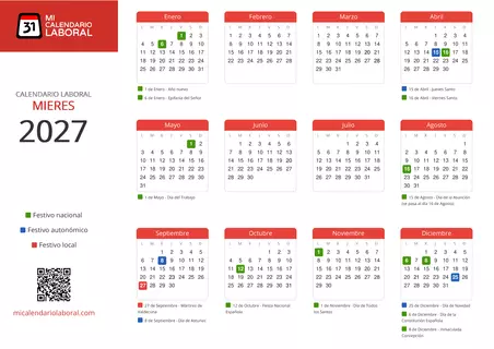 El calendario del año 2027 contará con 13 días festivos. Se suman a las 8 fiestas nacionales y las 4 determinadas por Gobierno del Principado de Asturias otras 1 fiestas locales, organizadas por los municipios de la región.