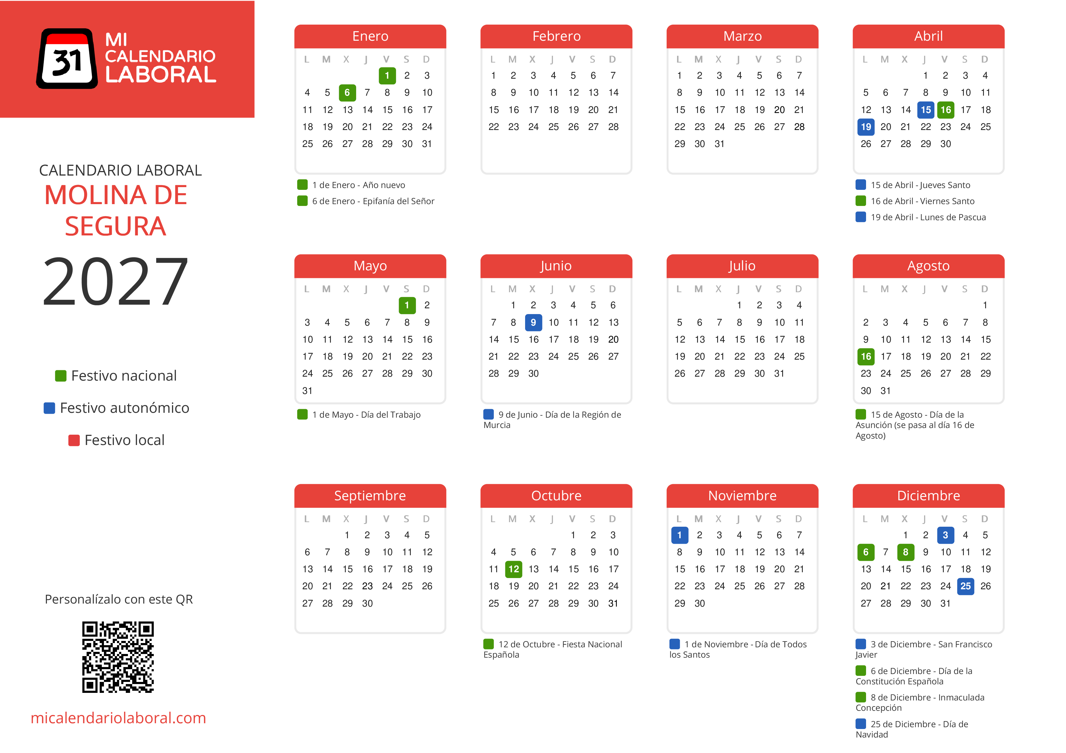 El calendario laboral de Molina de Segura del año 2027 contará con 12 días festivos.