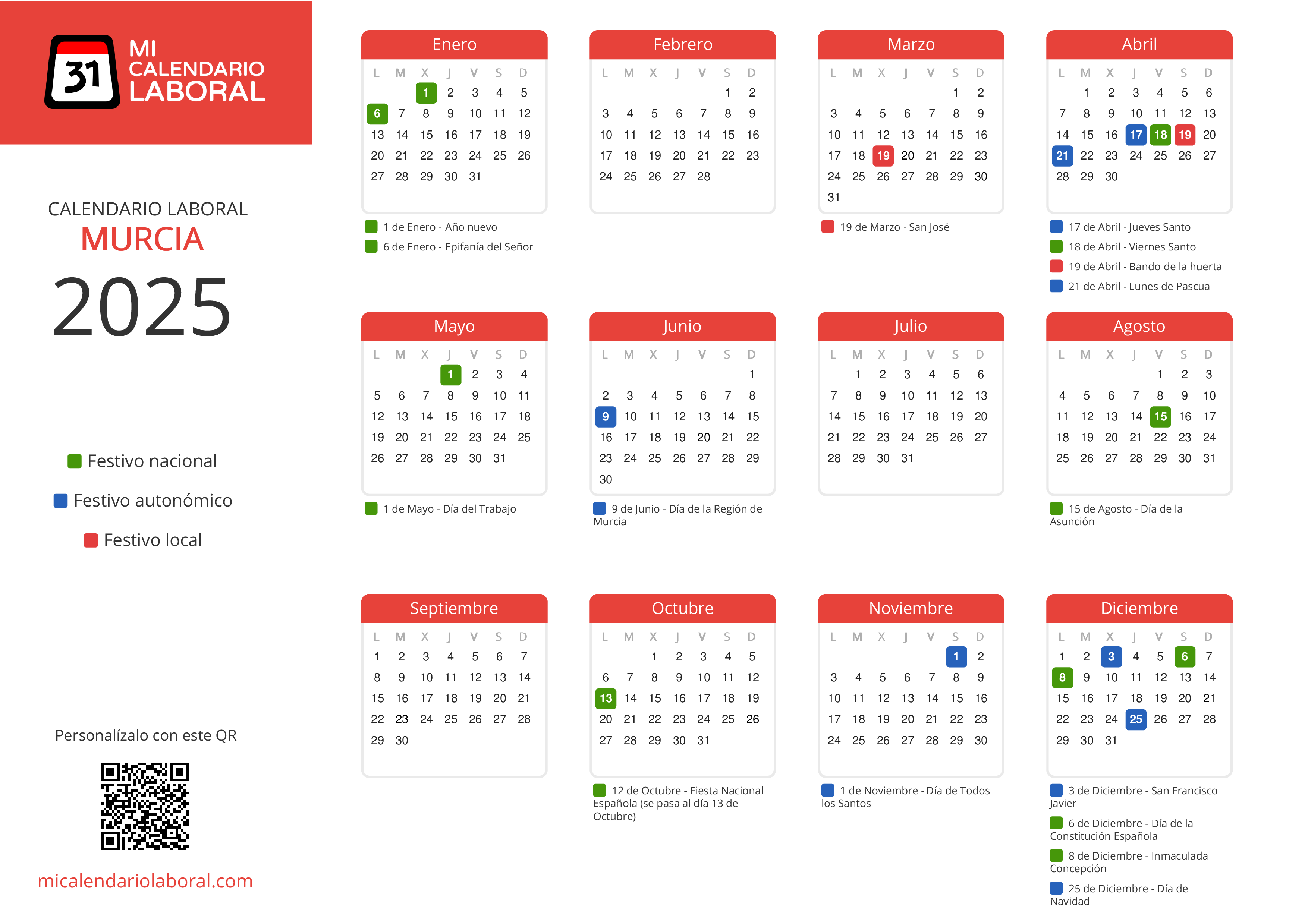 Así quedan los días festivos de Región de Murcia en el 2025 con los días festivos locales de Murcia: