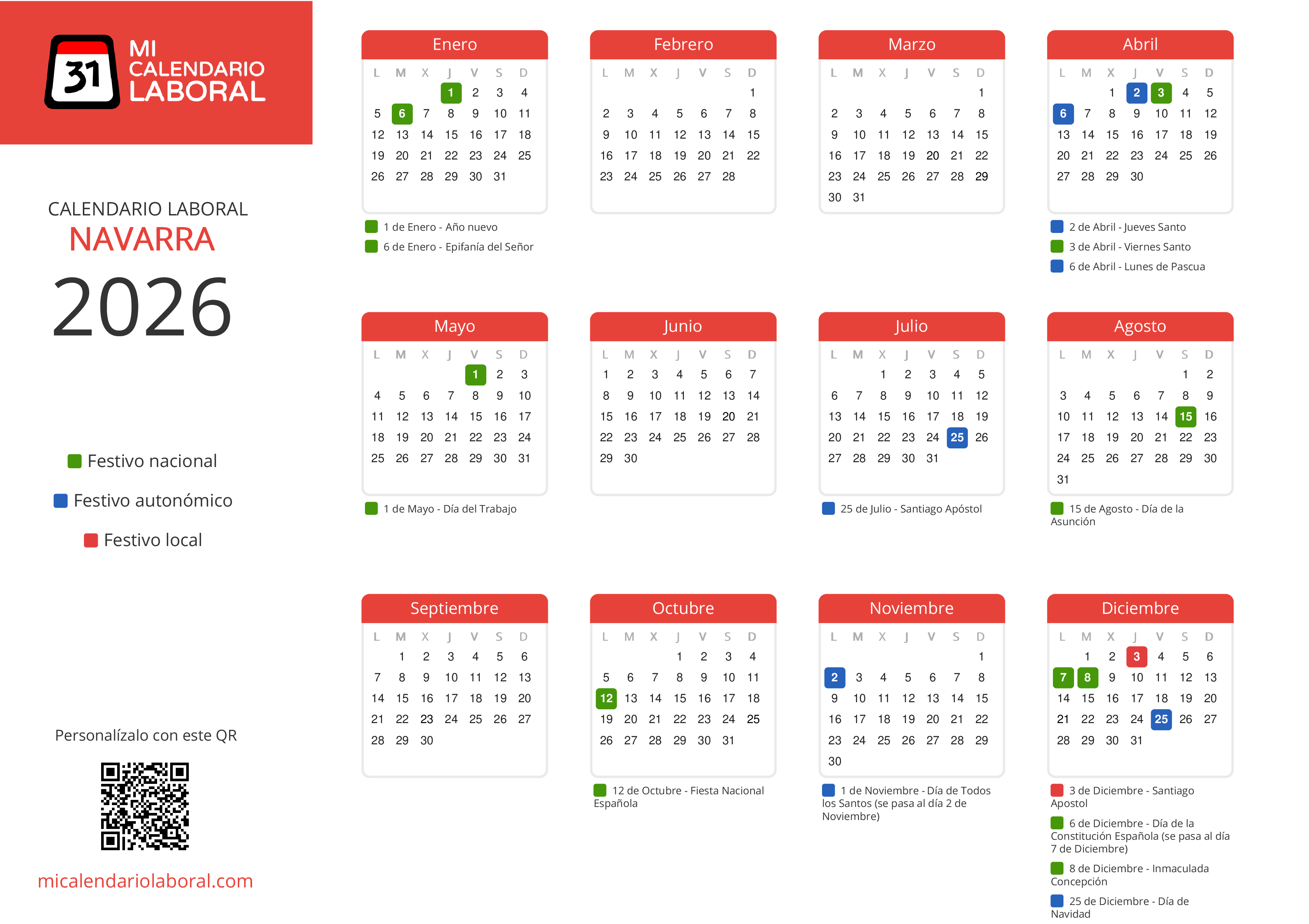 Este es el listado de días no laborables y días inhábiles en Navarra, proporcionado por el Ministerio del Trabajo y Gobierno de Navarra.