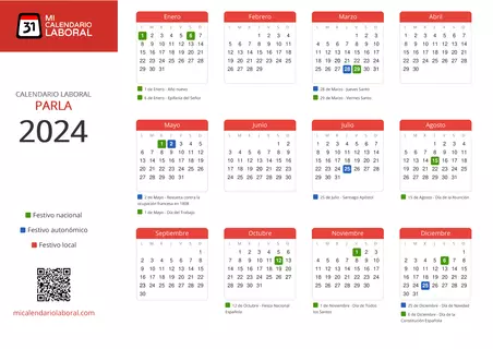 Los días no laborables y días inhábiles en Parla son listados a continuación, basados en la información del Ministerio del Trabajo y Gobierno de la Comunidad de Madrid.