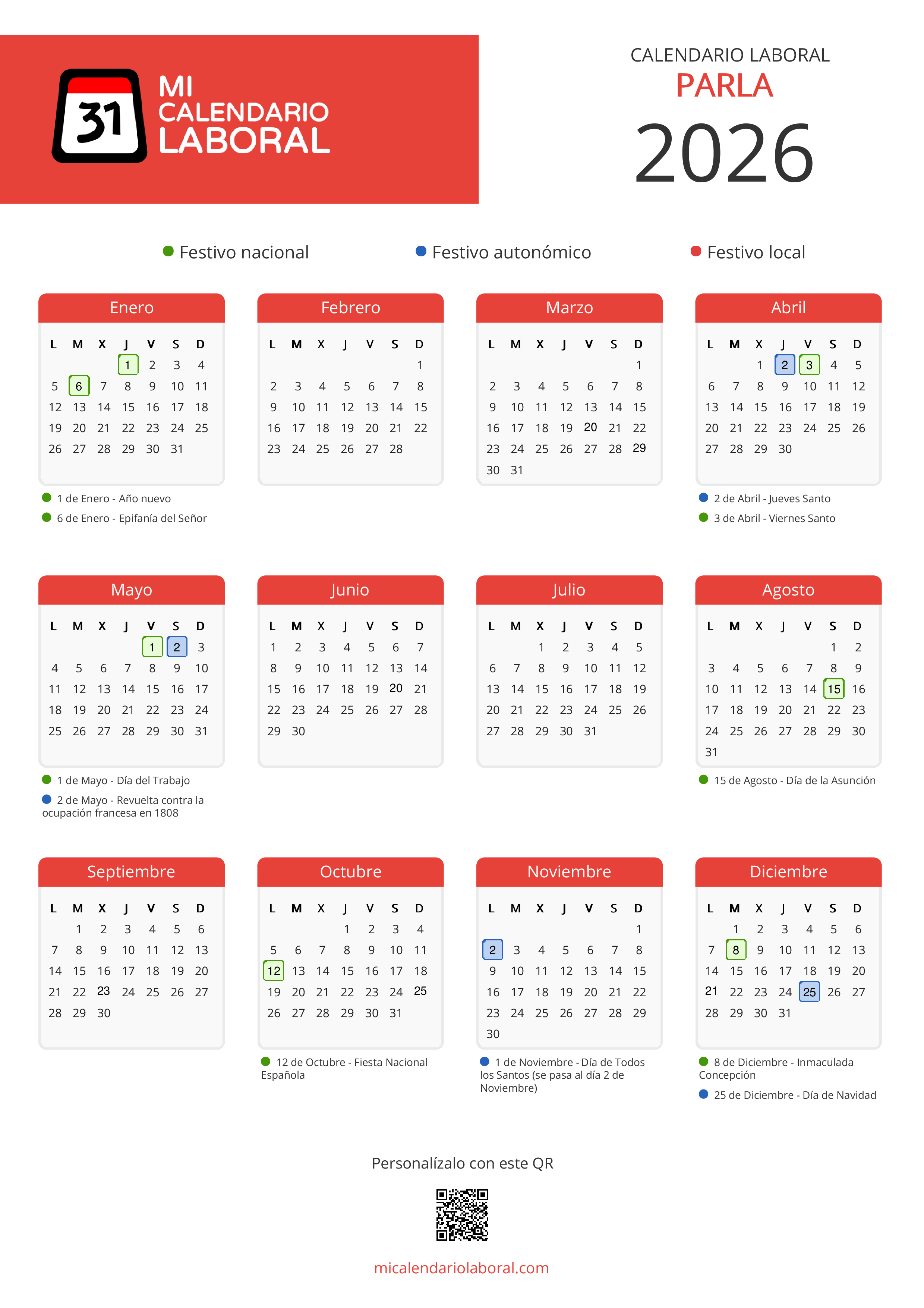 Los días no laborables y días inhábiles en Parla son listados a continuación, basados en la información del Ministerio del Trabajo y Gobierno de la Comunidad de Madrid.