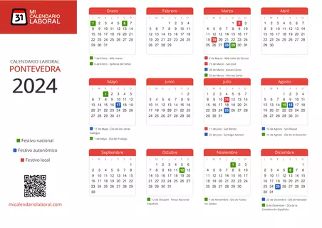 Los días no laborables y días inhábiles en Pontevedra son listados a continuación, basados en la información del Ministerio del Trabajo y Xunta de Galicia.