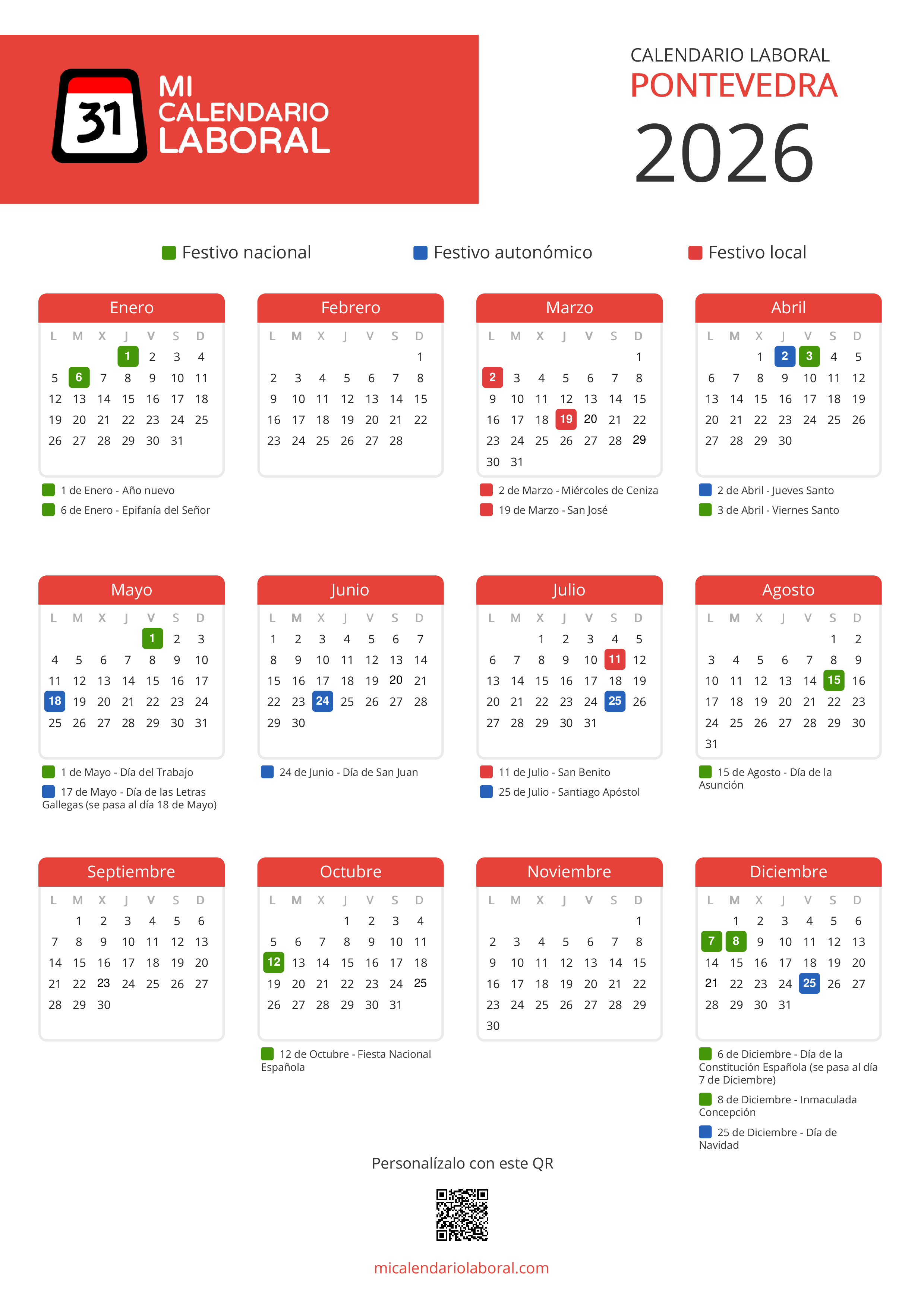 Almanaque de festivos en Pontevedra para el año 2026