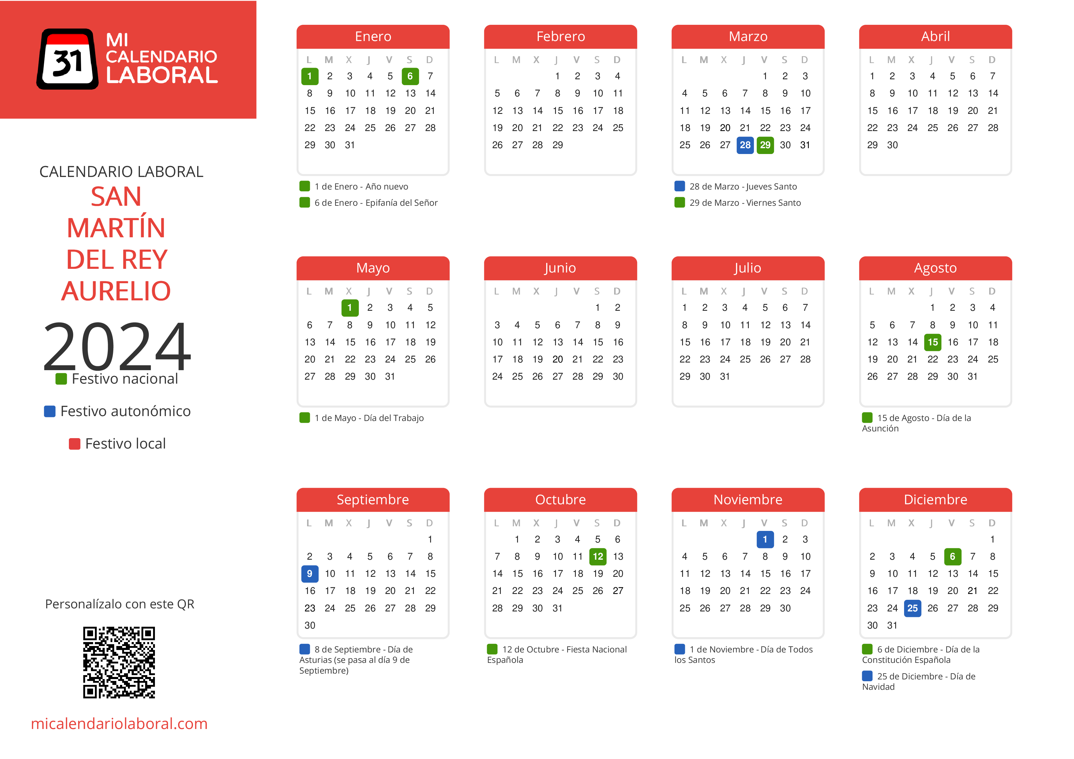 Almanaque de festivos en San Martín del Rey Aurelio para el año 2024