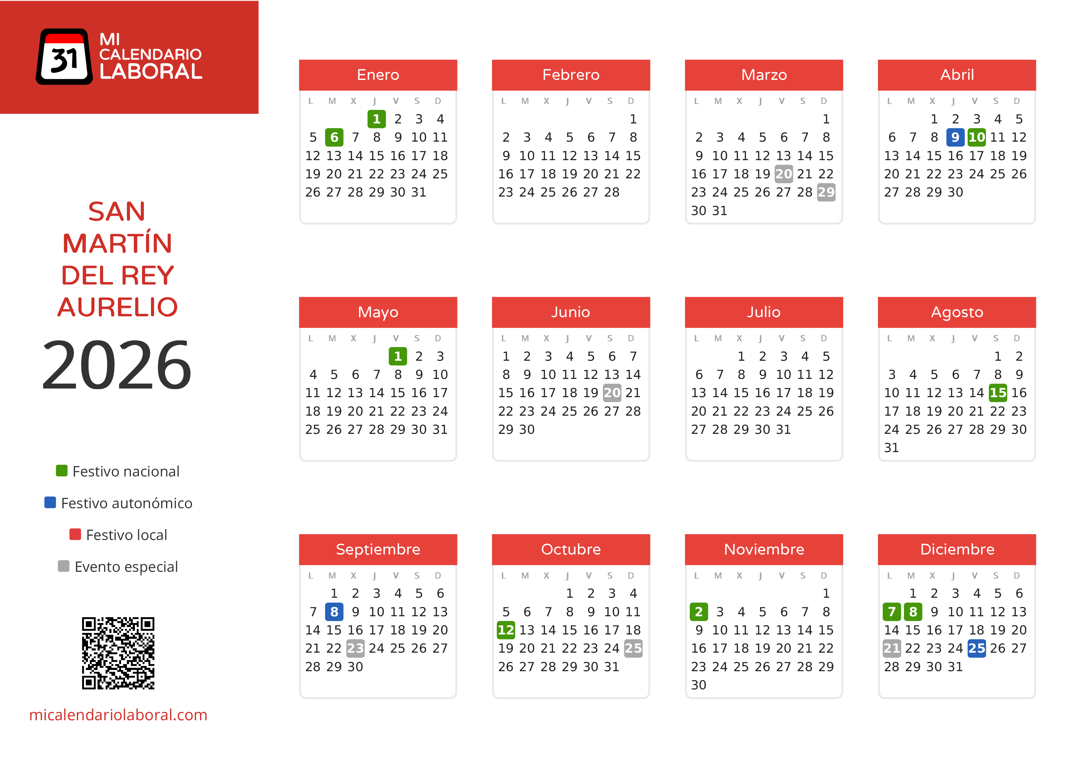 Almanaque de festivos en San Martín del Rey Aurelio para el año 2026