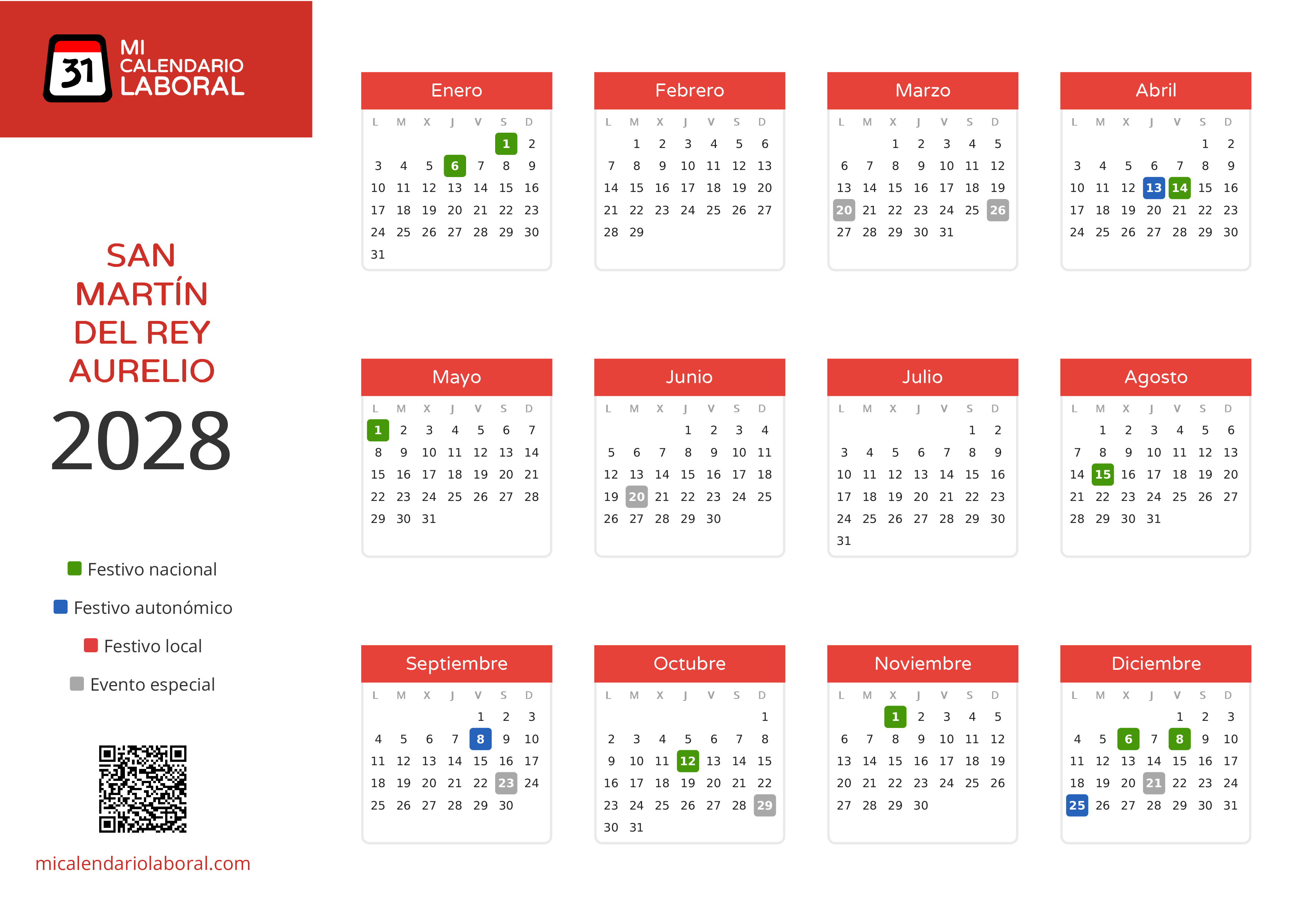 El calendario laboral de San Martín del Rey Aurelio del año 2028 contará con 12 días festivos.