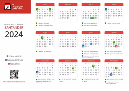 El calendario del año 2024 contará con 15 días festivos. Además de las 7 festividades nacionales y las 7 aprobadas por Gobierno de Cantabria, hay 1 festividades locales elegidas por cada ayuntamiento.