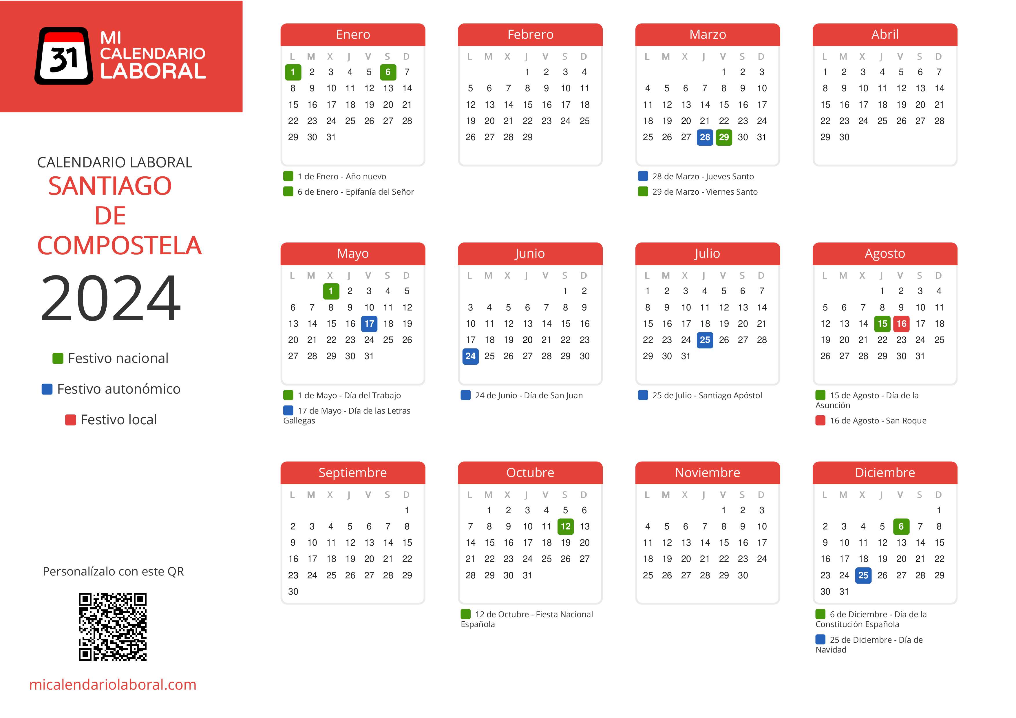 Almanaque de festivos en Santiago de Compostela para el año 2024