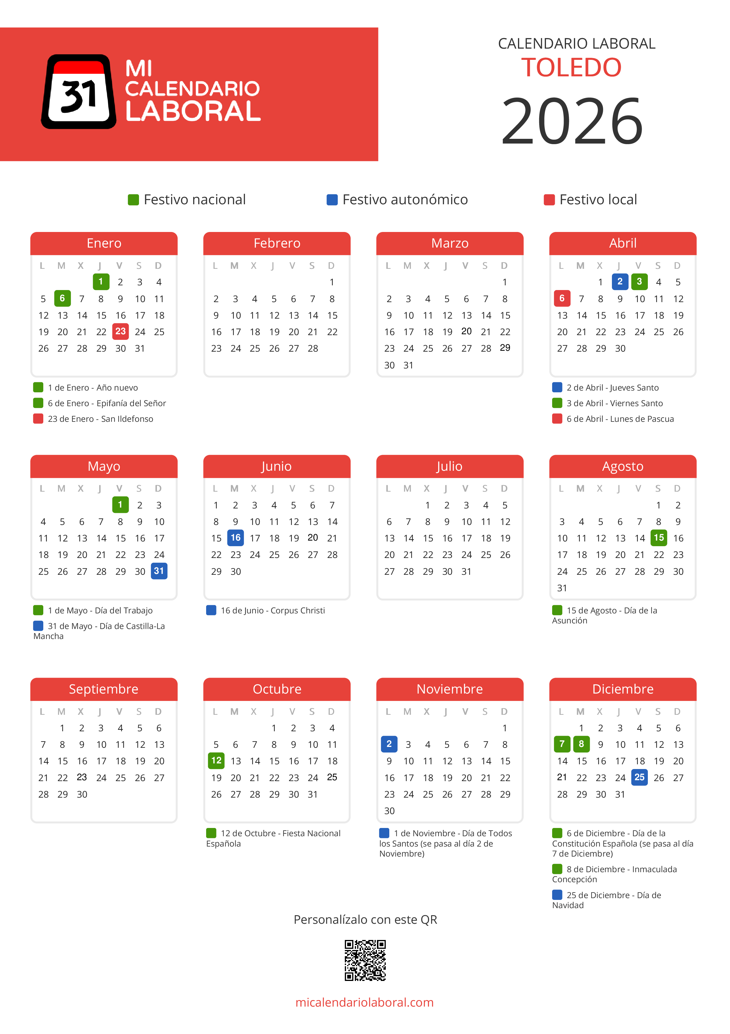 Almanaque de festivos en Toledo para el año 2026