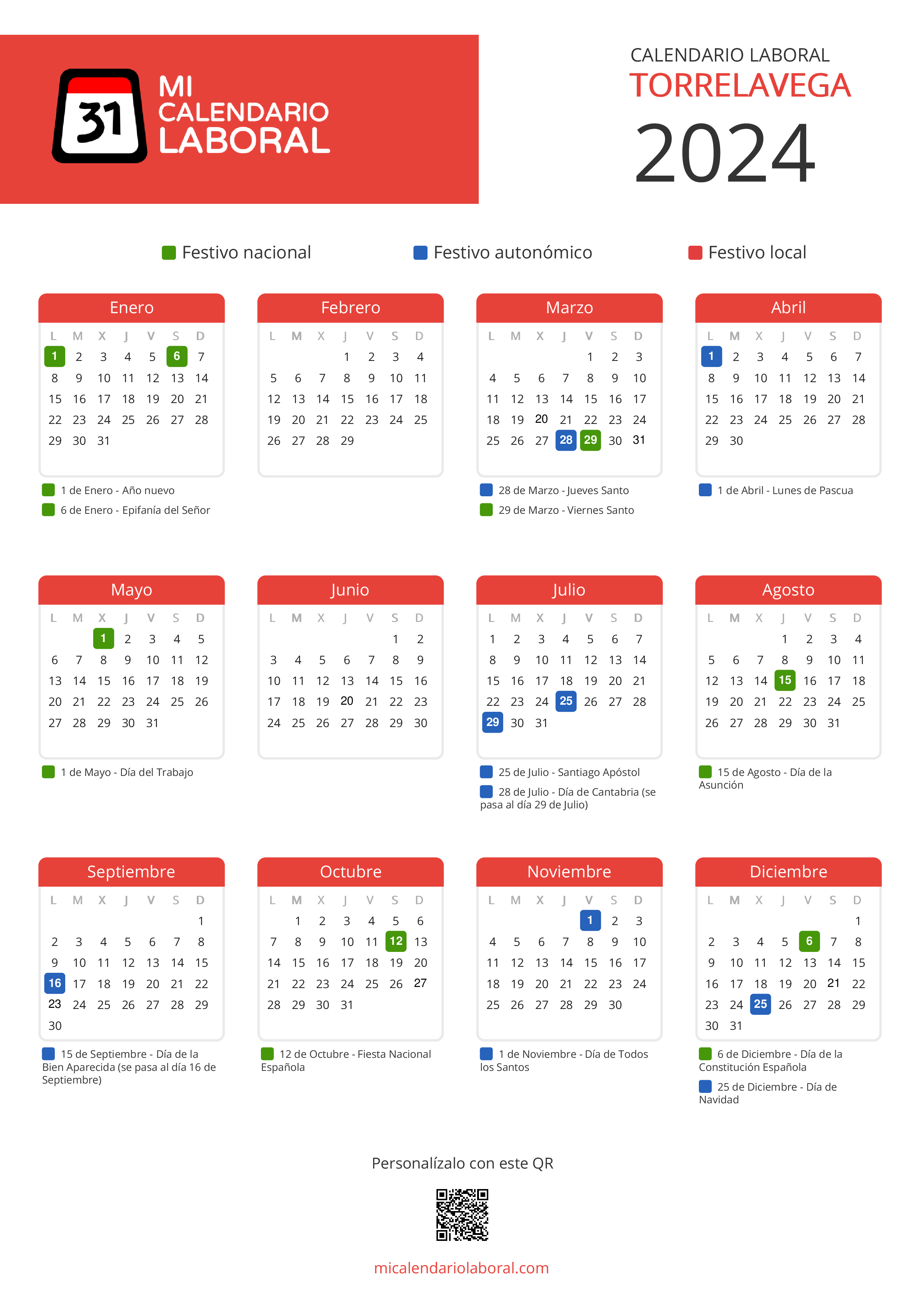 Almanaque de festivos en Torrelavega para el año 2024
