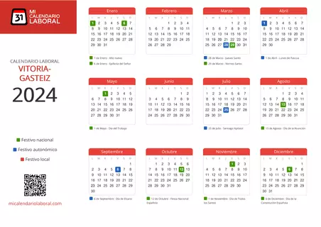 Almanaque de festivos en Vitoria-Gasteiz para el año 2024